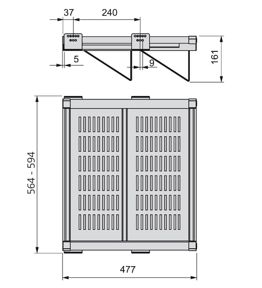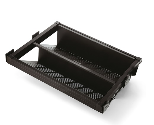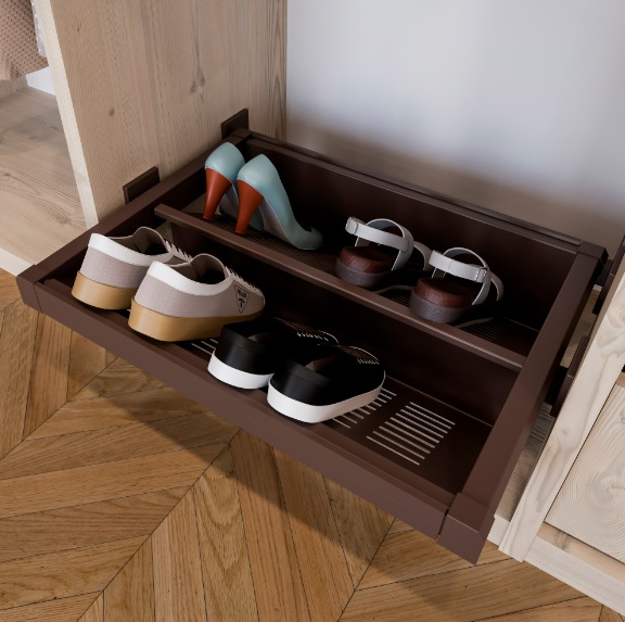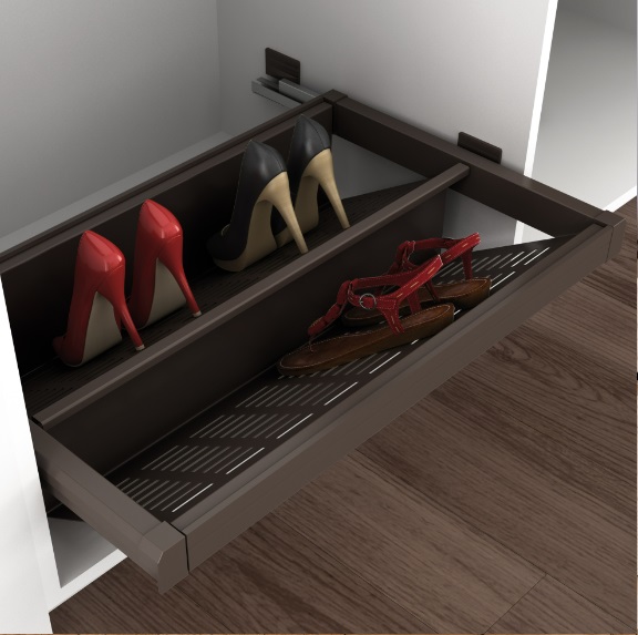 Kit compuesto por un cajón zapatero y un bastidor con guías ocultas de extracción total y cierre suave, además de con un sistema de clipado automático y rápido para la instalación del bastidor. Éste es regulable para poder adaptarlo al hueco interior del armario y están fabricados en aluminio pintado en color moka
