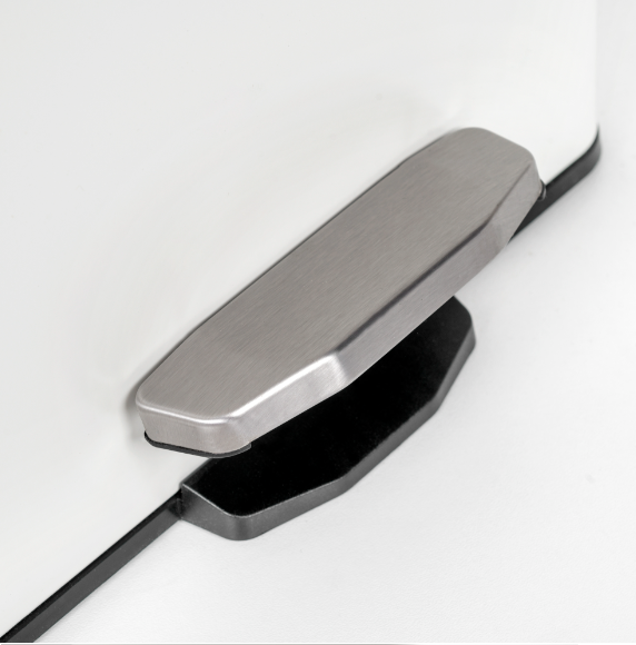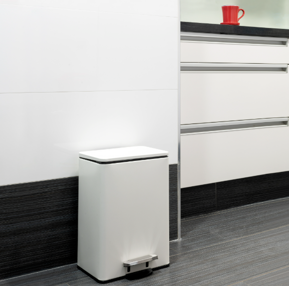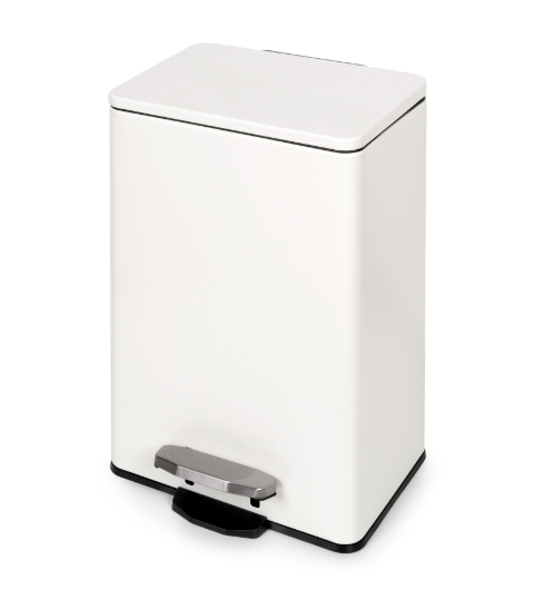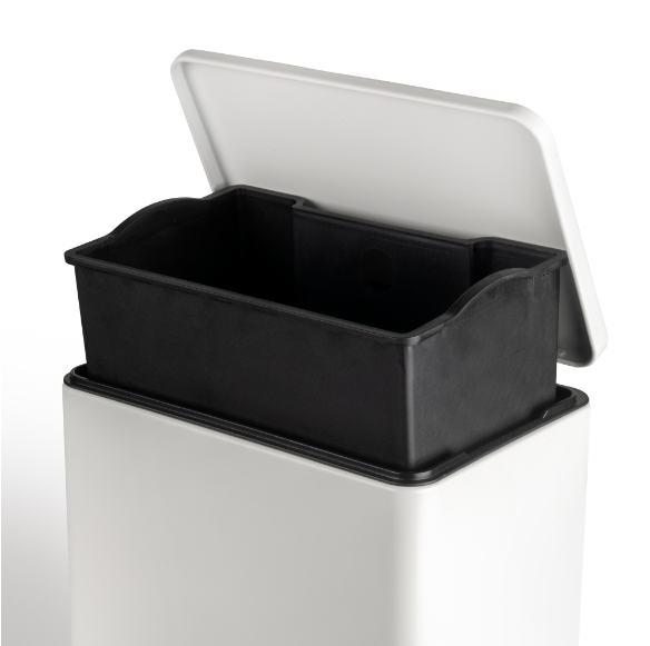 • Contenedor de basura rectangular Recycle con accionamiento de la tapa mediante pedal de acero inoxidable higiénico que facilita el uso cotidiano. El contenedor posee una capacidad de 12 litros e incluye una cubeta la cual se extrae para facilitar la retirada de los residuos. Gracias a su diseño realizado en aluminio y en acabado blanco mate se puede utilizar en cualquier zona del hogar, para la cocina, el baño y también para la oficina.